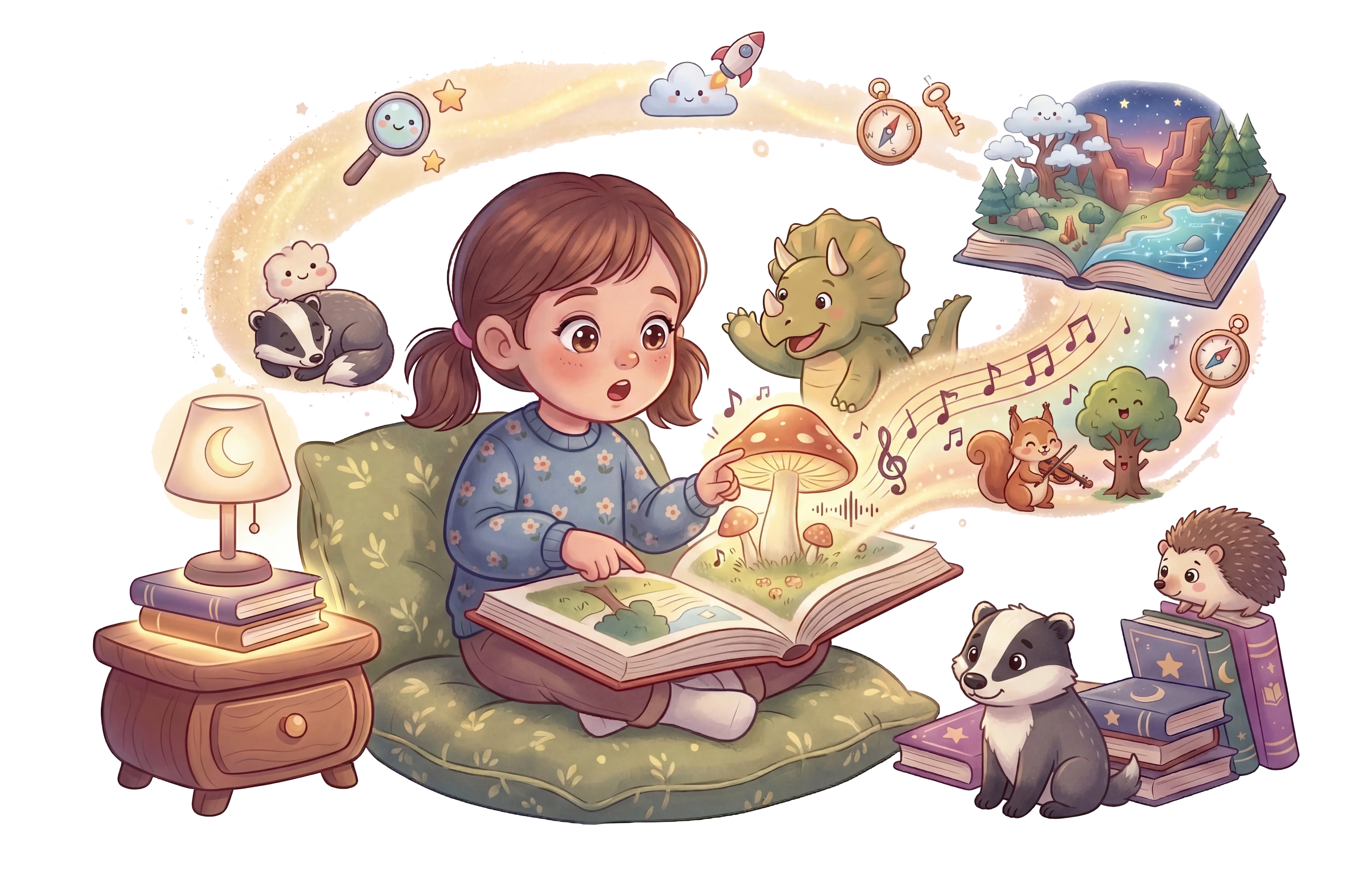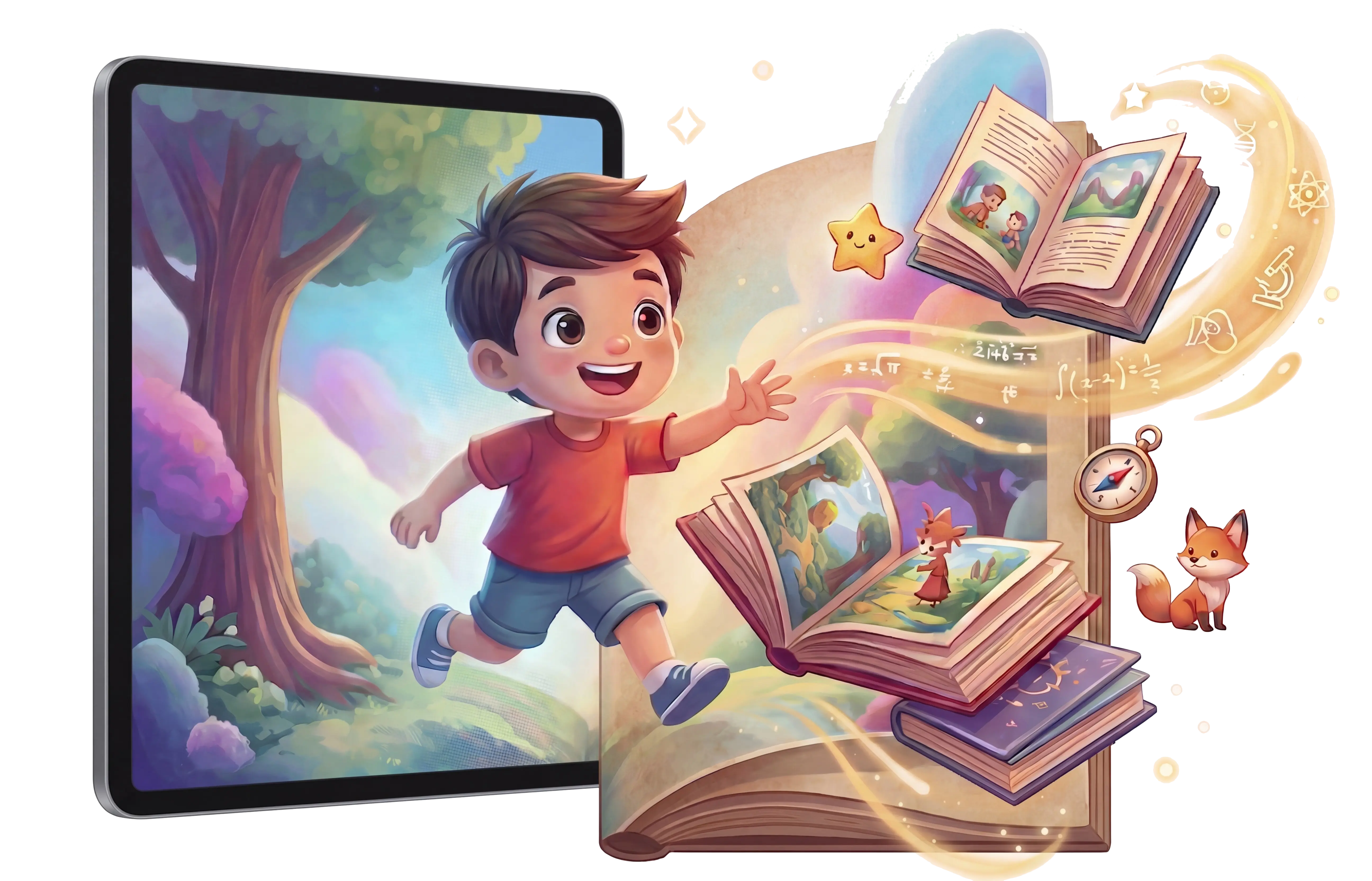 Stories feel alive: dinosaurs wave, mushrooms sing. Playful taps hook curiosity—reading turns into exploring; kids reach for books on their own.